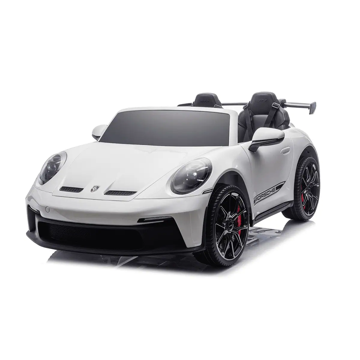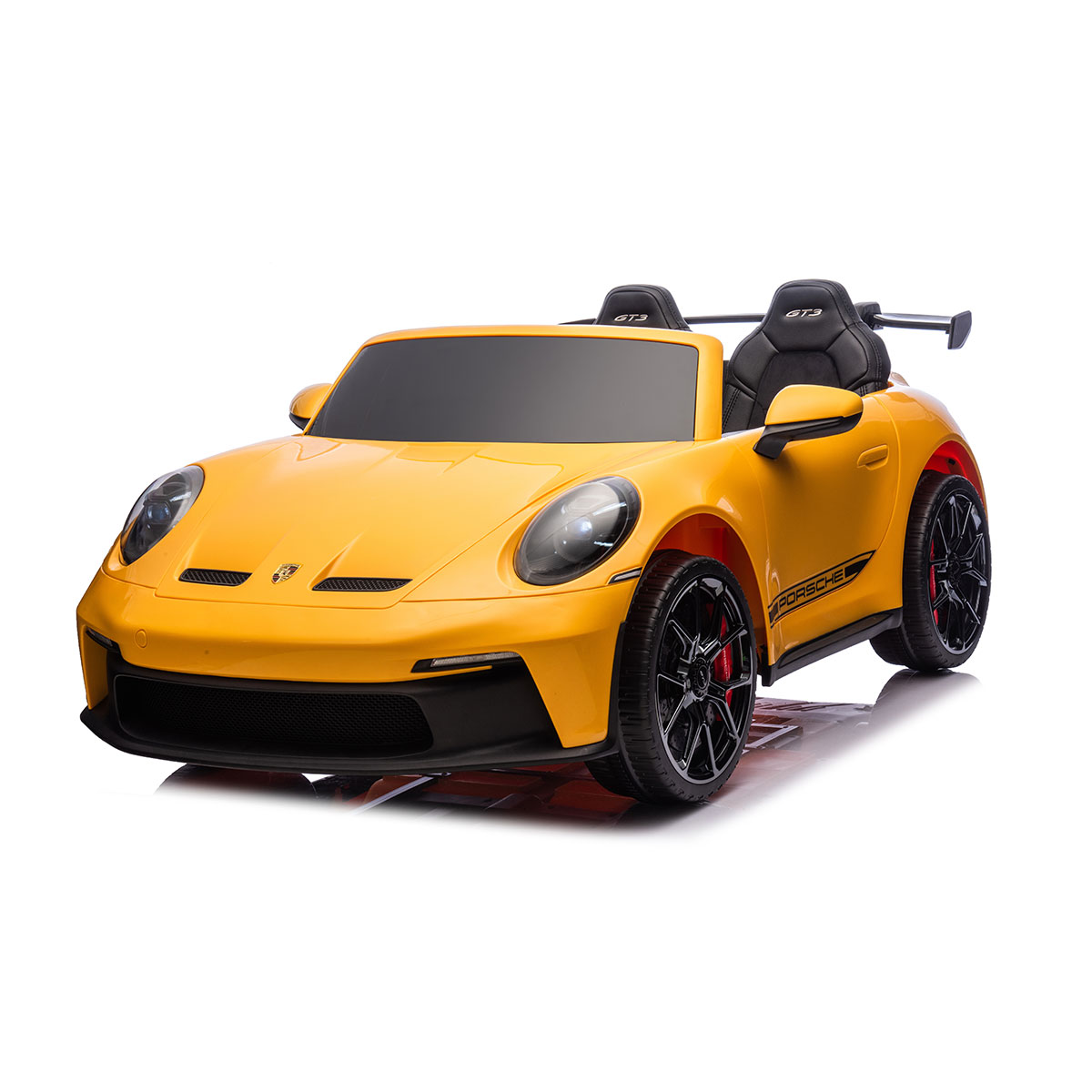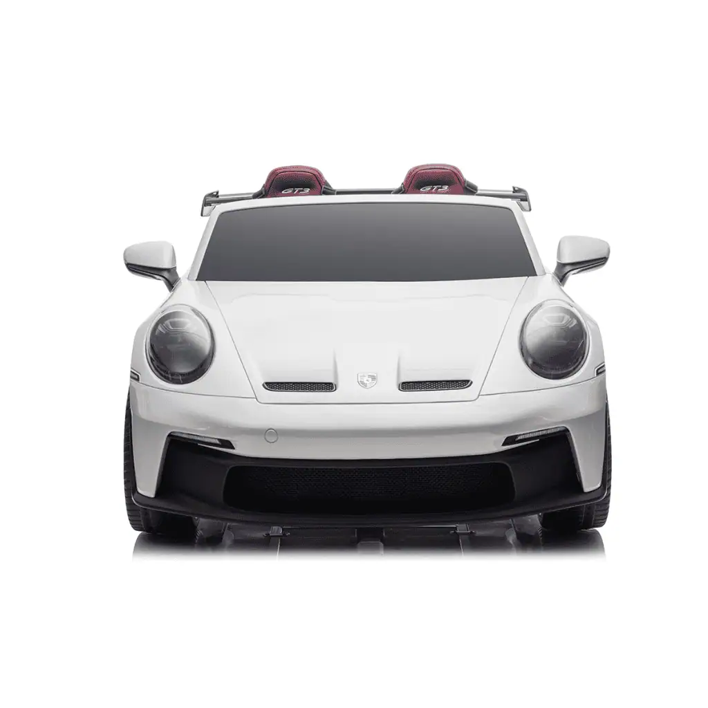 Licensed Porsche 911 GT3 comes with exciting features;Real Porsche Branding: Everything from the crest on the nose to the signature rear lights is factory-approved. Two-Seater Comfort: Siblings can ride together without arguing about who gets shotgun. Dual Control Modes: You can steer things from the remote while your child learns to pedal and turn on their own. Mini Multimedia Hub: Plug in MP3s, Bluetooth playlists, USB drives, or SD cards so the ride sounds as cool as it looks. Bright LED Lights : Working headlights, rear lamps, and colorful dashboard lights keep every evening drive in the spotlight. Start-Up Roar: A real key-twist gets the engine rumble and a quick beep of the horn, just like the grown-up versions. Spring Suspension: Hidden springs cushion bumps and dips, so rides feel mellow across grass, asphalt, or loose gravel. Inside or Outside: Smooth performance hops from the driveway to the living room without missing a beat.Safety Features: