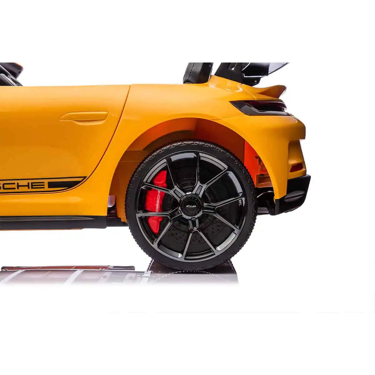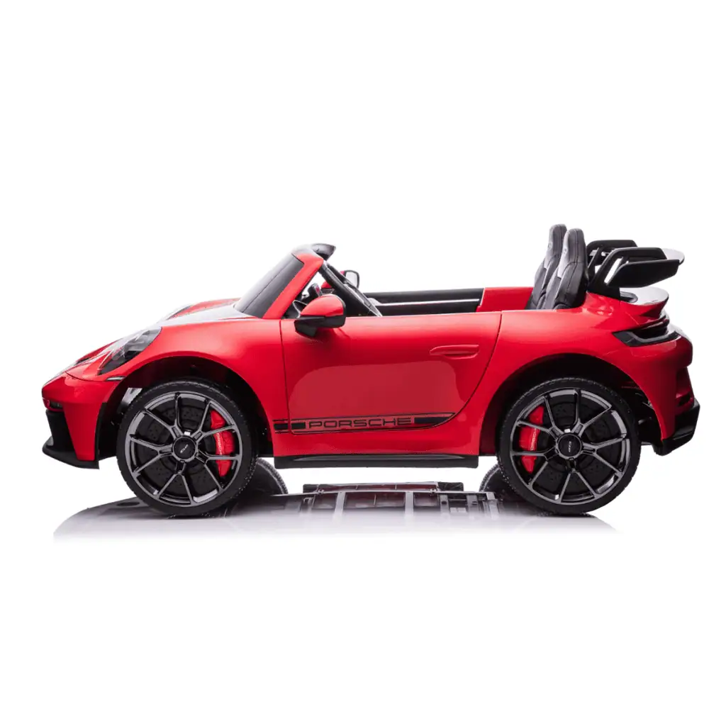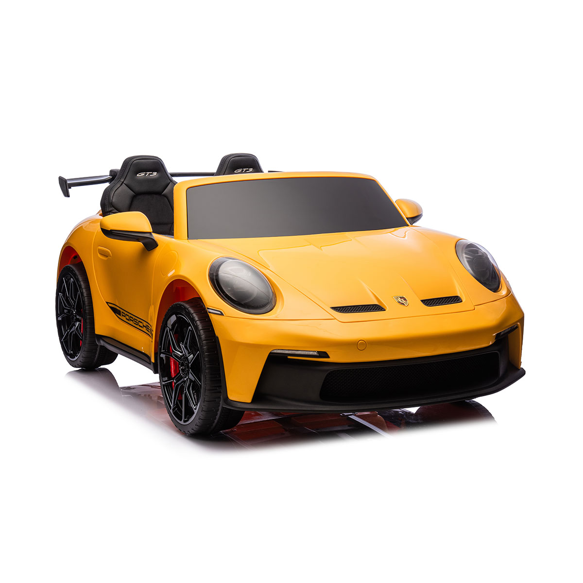 Licensed Porsche 911 GT3 comes with exciting features;Real Porsche Branding: Everything from the crest on the nose to the signature rear lights is factory-approved. Two-Seater Comfort: Siblings can ride together without arguing about who gets shotgun. Dual Control Modes: You can steer things from the remote while your child learns to pedal and turn on their own. Mini Multimedia Hub: Plug in MP3s, Bluetooth playlists, USB drives, or SD cards so the ride sounds as cool as it looks. Bright LED Lights : Working headlights, rear lamps, and colorful dashboard lights keep every evening drive in the spotlight. Start-Up Roar: A real key-twist gets the engine rumble and a quick beep of the horn, just like the grown-up versions. Spring Suspension: Hidden springs cushion bumps and dips, so rides feel mellow across grass, asphalt, or loose gravel. Inside or Outside: Smooth performance hops from the driveway to the living room without missing a beat.Safety Features: